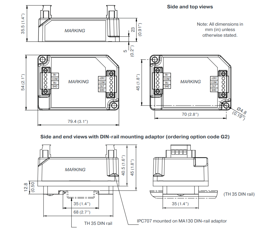 The IPC707 signal conditioner's circuitry is enclosed in a die-cast aluminum housing. The IPC707 can be mounted using screws through the housing's mounting holes or on a DIN rail using an optional DIN rail mounting adapter. The IPC707 housing also features removable screw terminal connectors that can be removed from the housing, simplifying installation.